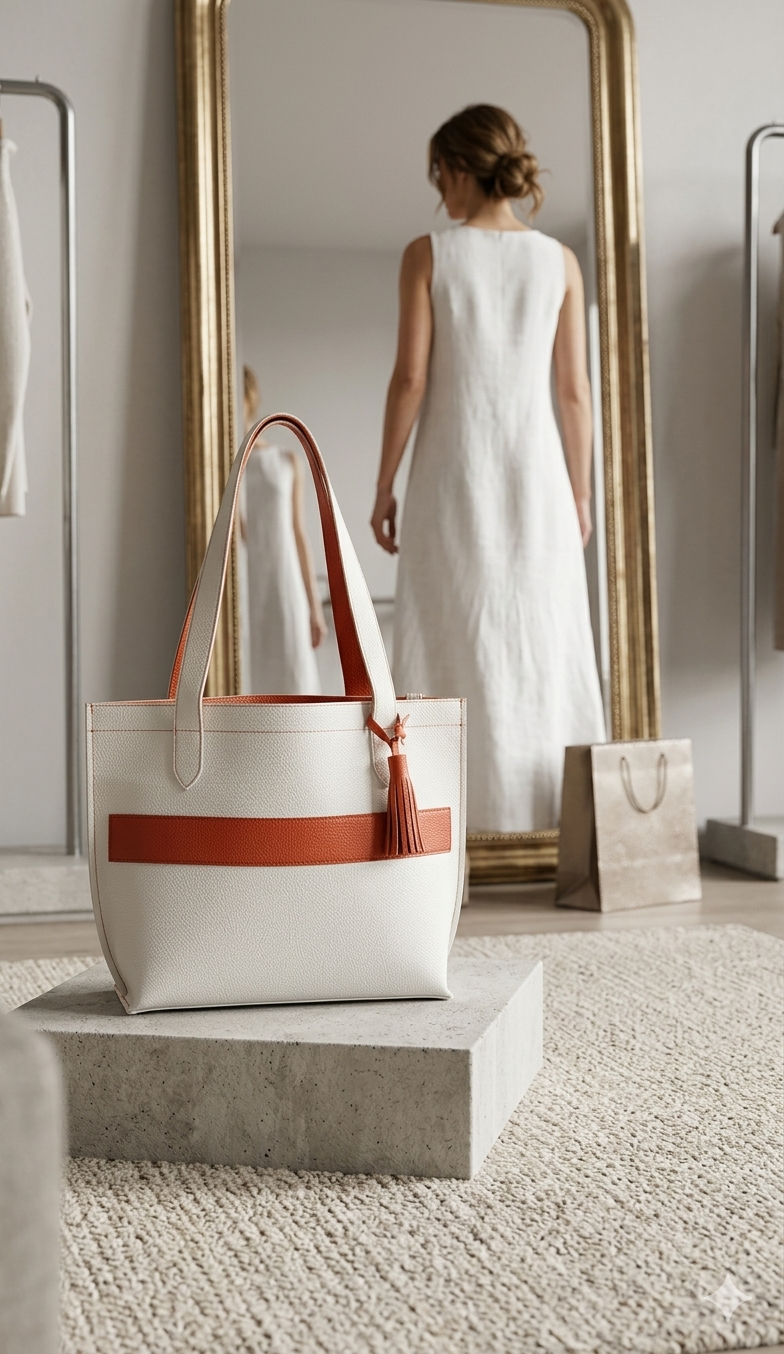 Laissez-vous séduire par l’alliance parfaite du blanc texturé et de l’éclat orange terre cuite. Ce cabas est bien plus qu’un sac, c’est la pièce maîtresse qui sublimera toutes vos tenues, du bureau à vos sorties du week-end.