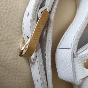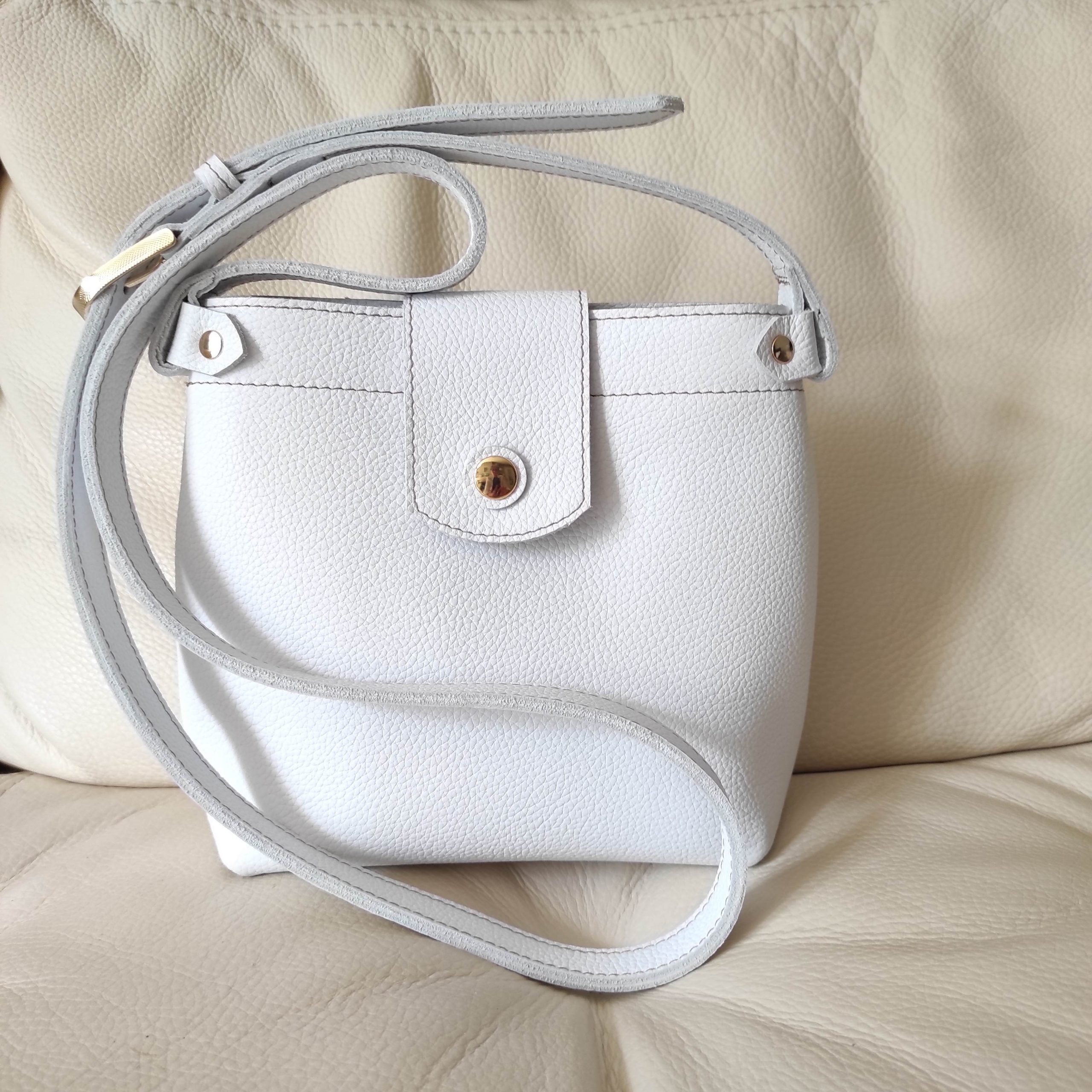 Laissez-vous séduire par ce petit sac bandoulière au design épuré et sophistiqué. Confectionné dans un cuir grainé de haute qualité d’un blanc pur et lumineux, il se distingue par la finesse de sa texture et son fermoir bouton-pression doré élégant. Un accessoire intemporel qui apportera une touche de lumière et de distinction à toutes vos tenues. Cuir de vachette grainé dim 19 x 20 x 5 cm